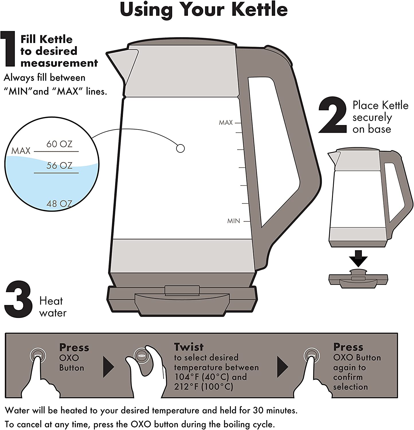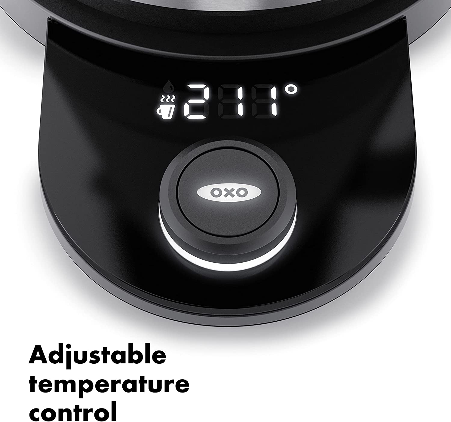 Take control of your hot beverages with the OXO Brew Adjustable Temperature Kettle. Just twist the knob to set the desired temperature for your tea or coffee (170 °F to 212 °F / 76 °C to 100 °C). The water is heated and held at that temperature for up to 30 minutes. The BPA-free, 1.75-liter-capacity Kettle features borosilicate glass for thermal-shock protection, a removable stainless steel filter, and an auto shut-off feature. The soft-open lid slowly releases steam while the secure grip stays cool to the touch. A generous opening provides easy filling and cleaning, and the cord wraps around the base for compact storage.